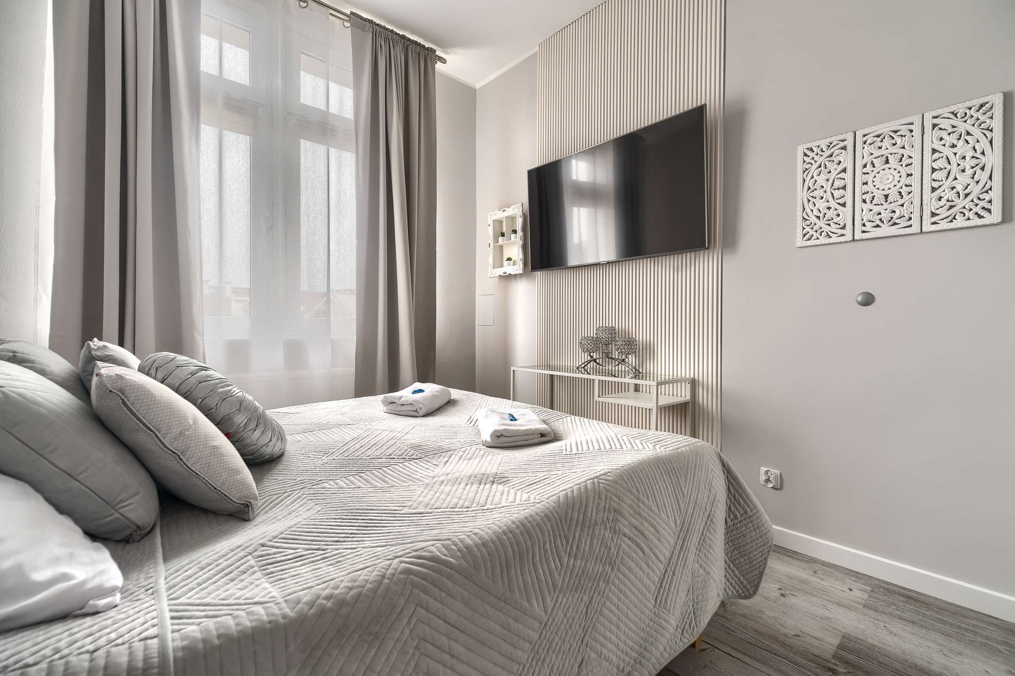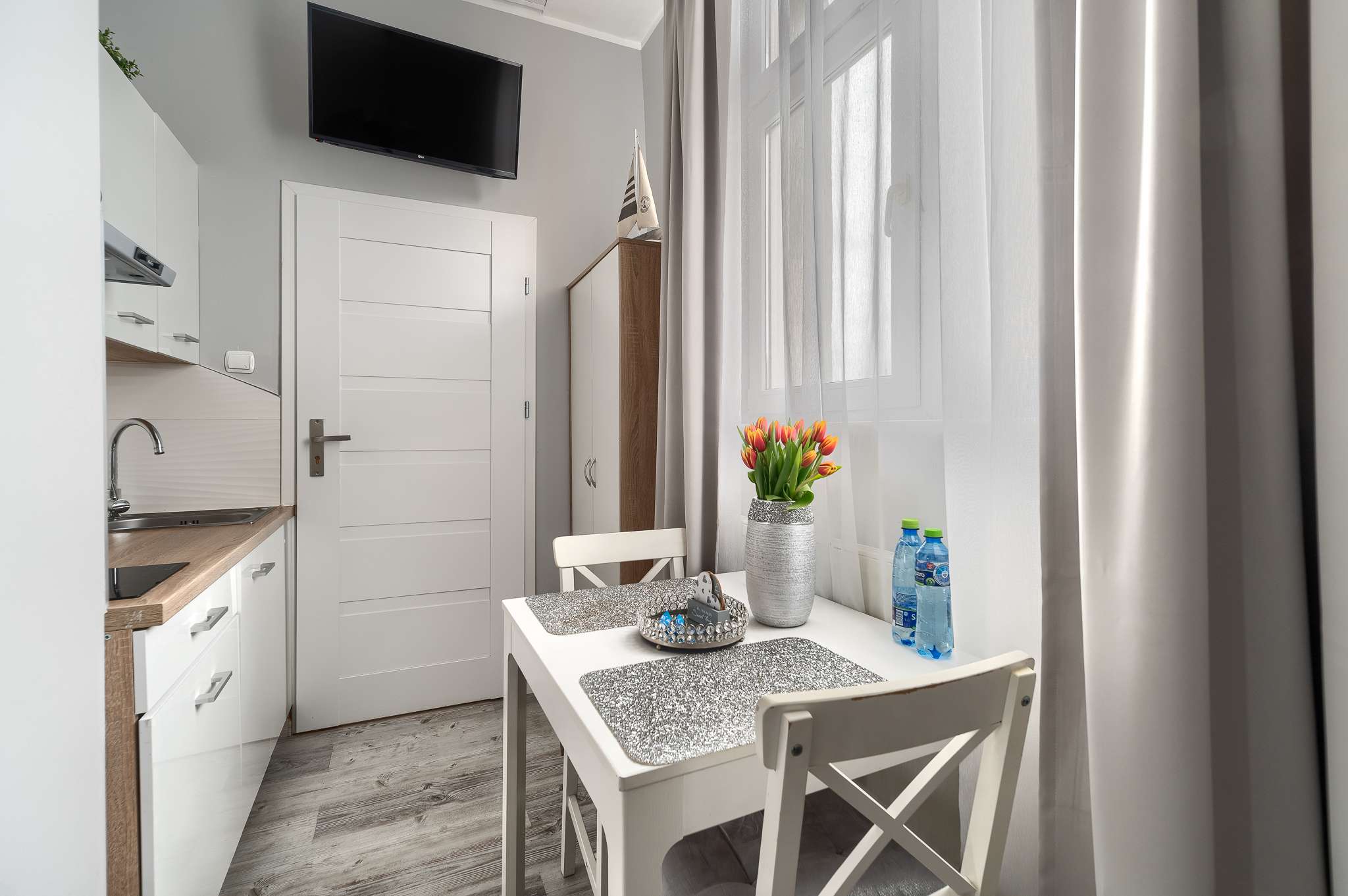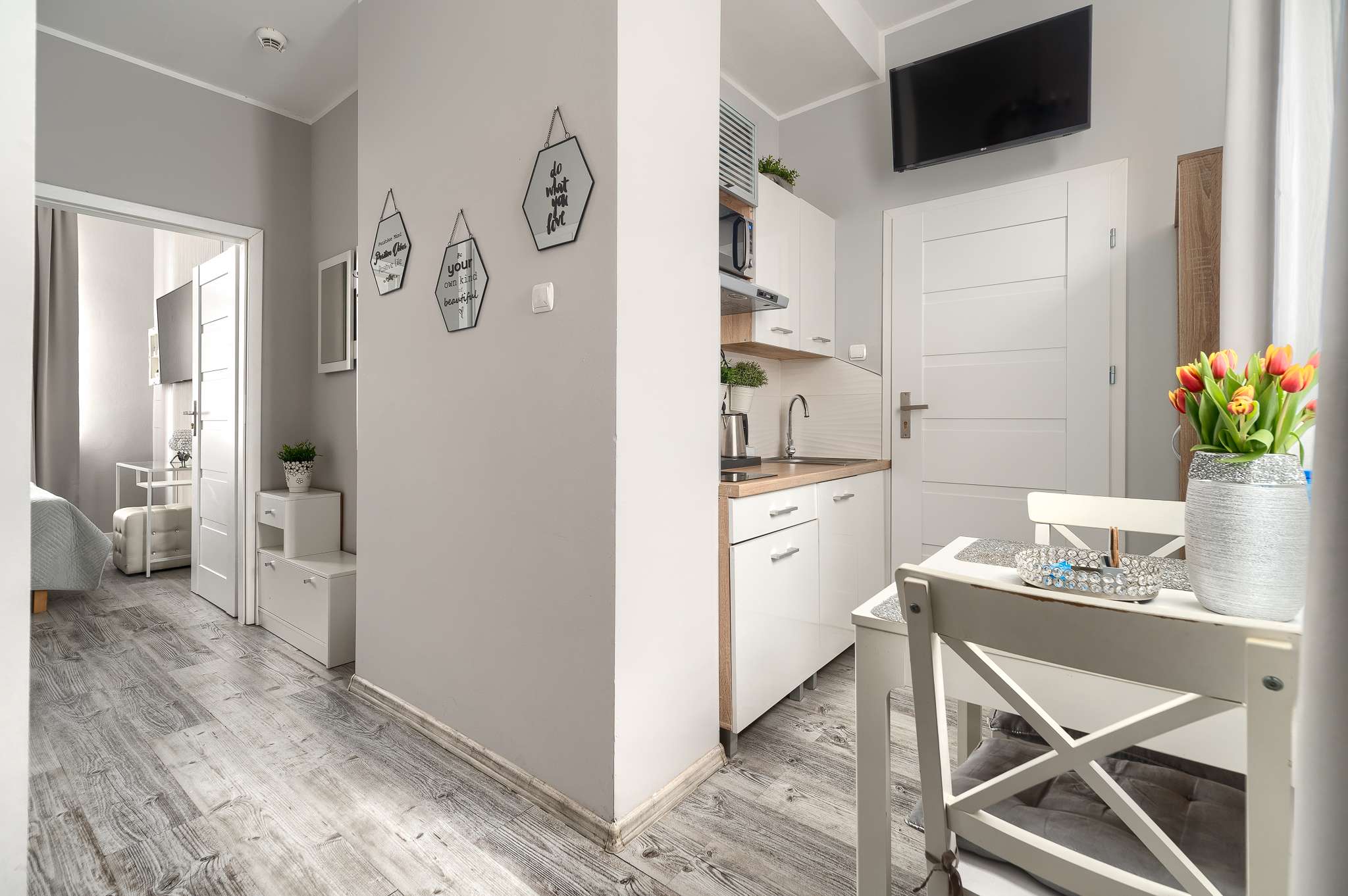 Do dyspozycji Gości pozostaje wygodne łóżko w oddzielnej sypialni, nowoczesna łazienka oraz w pełni wyposażony aneks kuchenny, który pozwala cieszyć się niezależnością podczas pobytu. W salonie znajduje się rozkładana sofa (140 cm) oraz stół z krzesłami, idealny do wspólnych posiłków czy pracy. Apartament został wyposażony w dwa telewizory – w salonie i w sypialni oraz dwie szafy, dzięki czemu oferuje jeszcze większą wygodę i przestrzeń do przechowywania. Uzupełnieniem są nowoczesne udogodnienia oraz sejf, który gwarantuje poczucie bezpieczeństwa i spokoju.