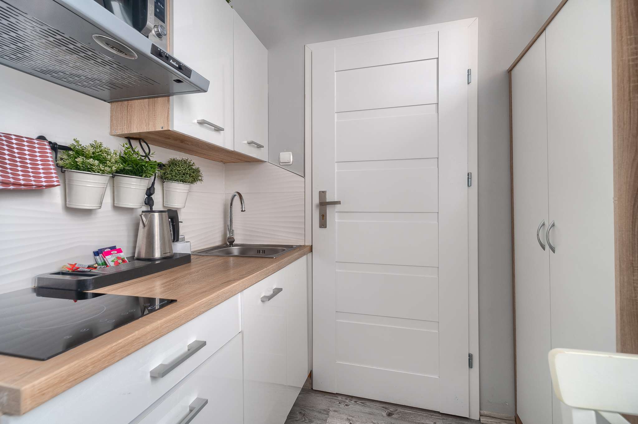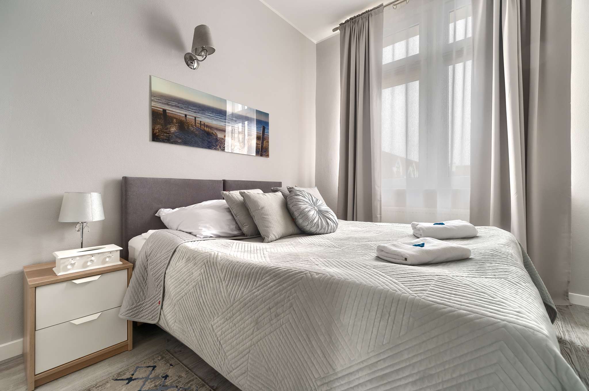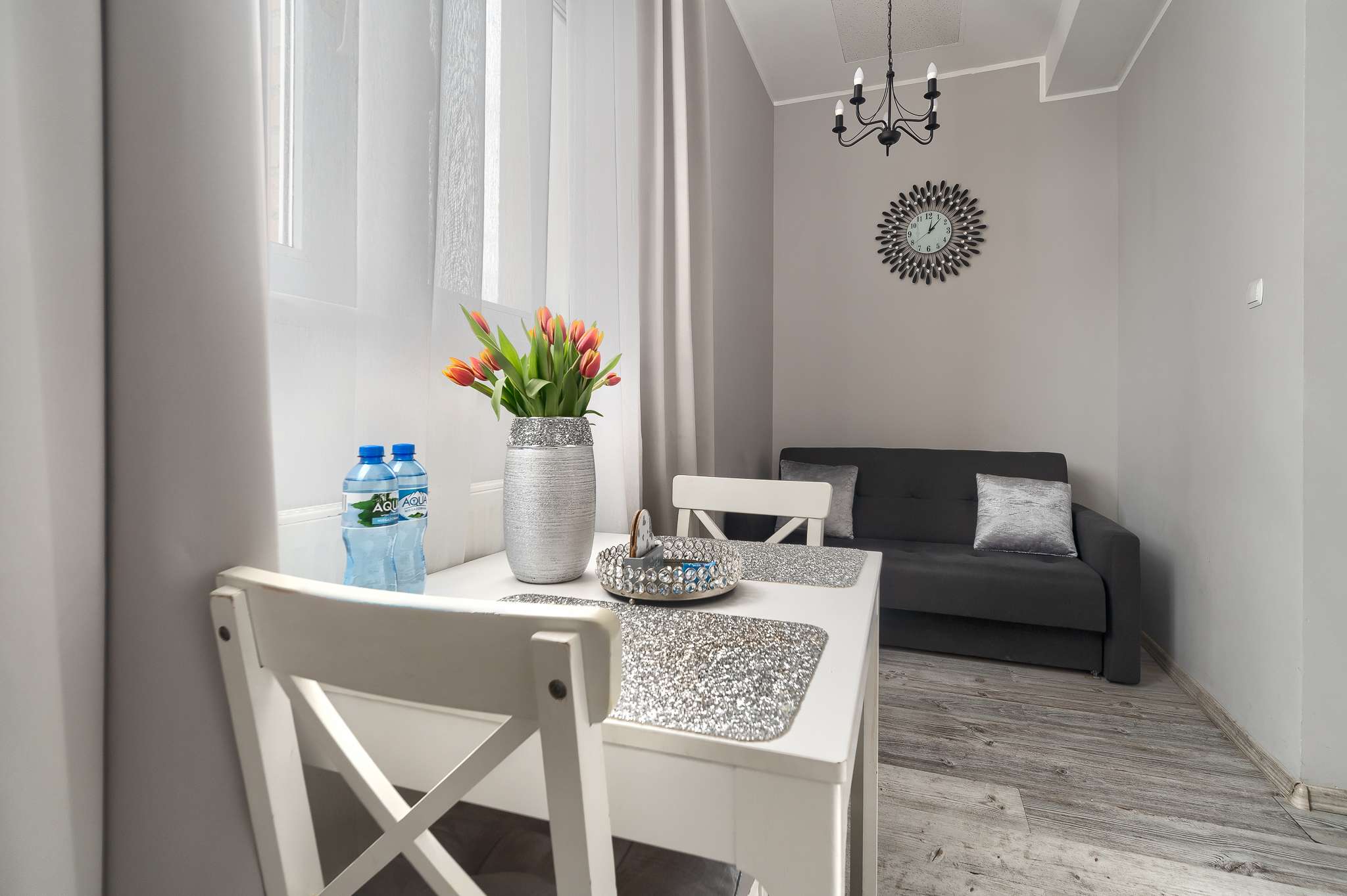 Do dyspozycji Gości pozostaje wygodne łóżko w oddzielnej sypialni, nowoczesna łazienka oraz w pełni wyposażony aneks kuchenny, który pozwala cieszyć się niezależnością podczas pobytu. W salonie znajduje się rozkładana sofa (140 cm) oraz stół z krzesłami, idealny do wspólnych posiłków czy pracy. Apartament został wyposażony w dwa telewizory – w salonie i w sypialni oraz dwie szafy, dzięki czemu oferuje jeszcze większą wygodę i przestrzeń do przechowywania. Uzupełnieniem są nowoczesne udogodnienia oraz sejf, który gwarantuje poczucie bezpieczeństwa i spokoju.