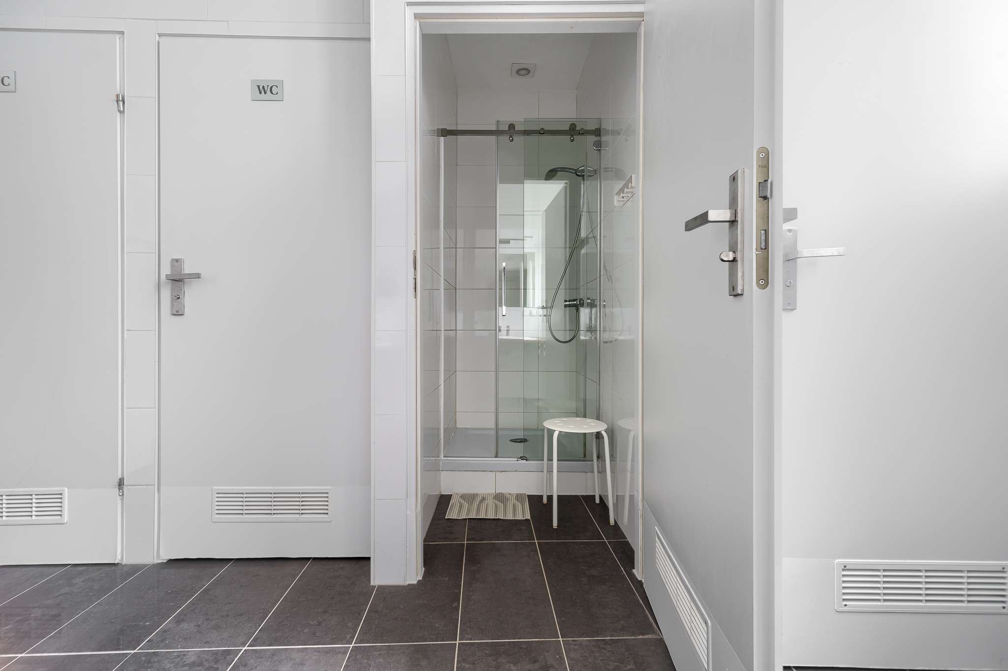 Łazienka znajduje się na korytarzu i jest współdzielona z innymi Gośćmi. Nie ma podziału na damską i męską – wszyscy korzystają z tych samych sanitariatów, które są utrzymywane w czystości i zapewniają odpowiedni standard. Dodatkowo do dyspozycji Gości pozostaje wspólna kuchnia, wyposażona w podstawowe sprzęty i akcesoria, umożliwiająca samodzielne przygotowanie posiłków.