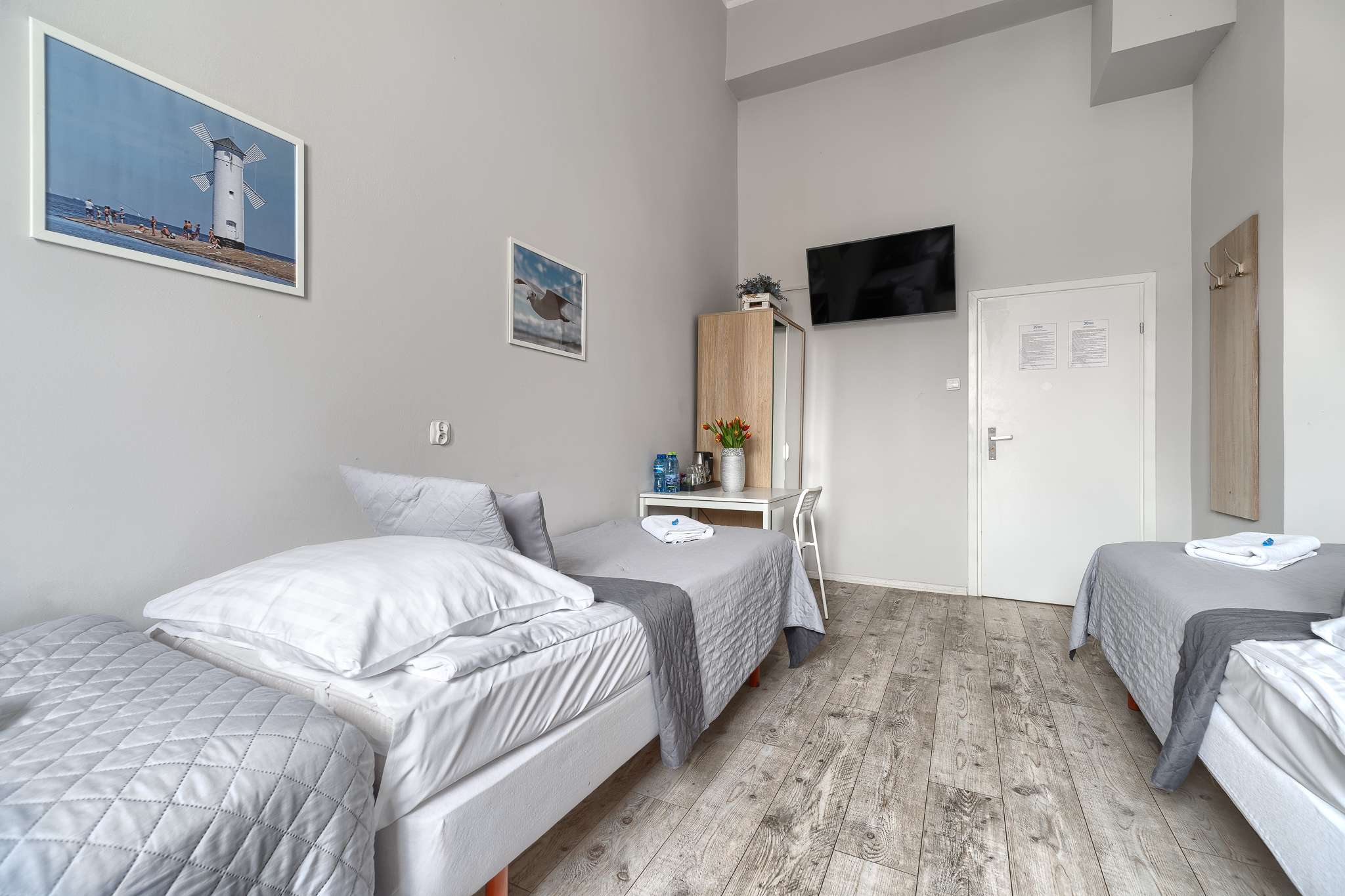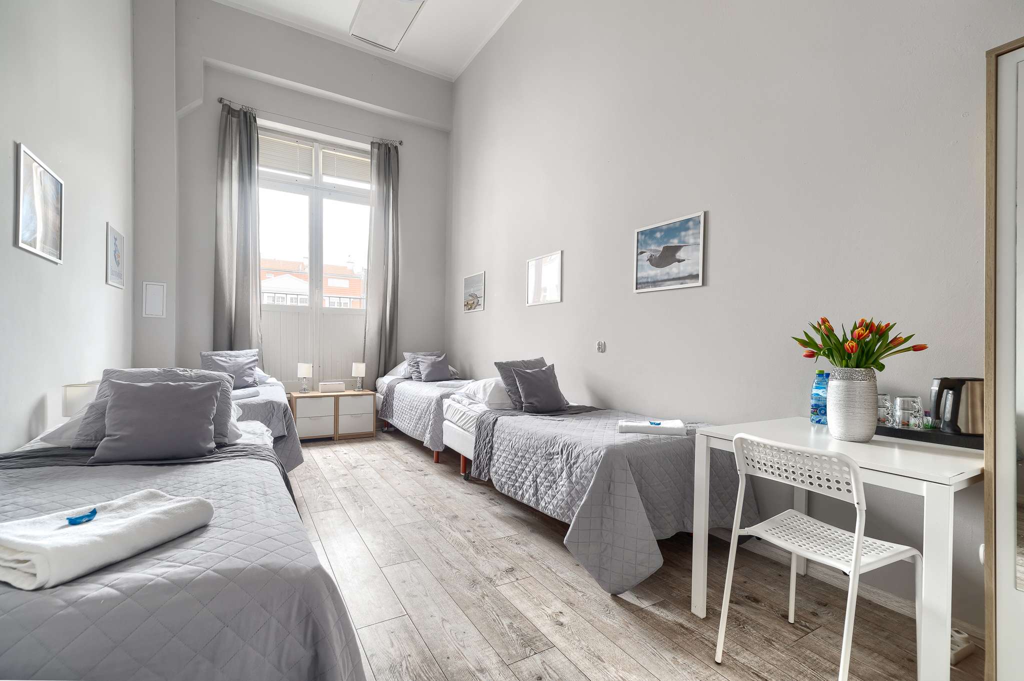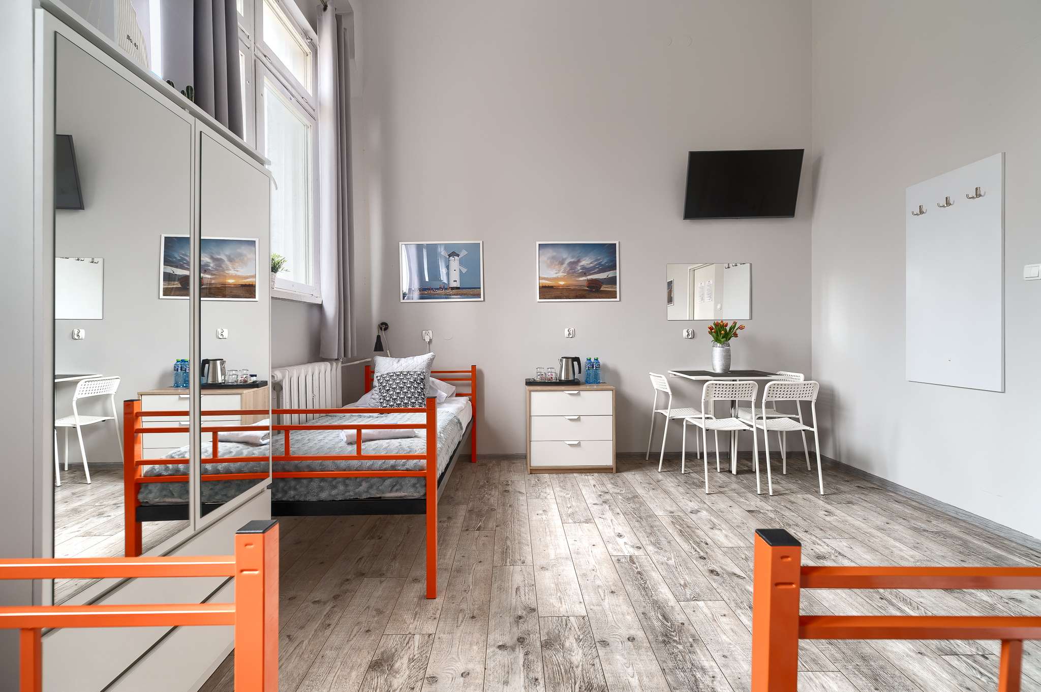 Pokój hostelowy z 4 łóżkami pojedynczymi to praktyczne i ekonomiczne rozwiązanie dla rodzin, grup przyjaciół lub współpracowników podróżujących razem. Pokój jest prywatny, przeznaczony do wyłącznego użytku Gości, a cztery oddzielne łóżka z wygodnymi materacami zapewniają komfortowy wypoczynek i spokojny sen każdemu z nich.