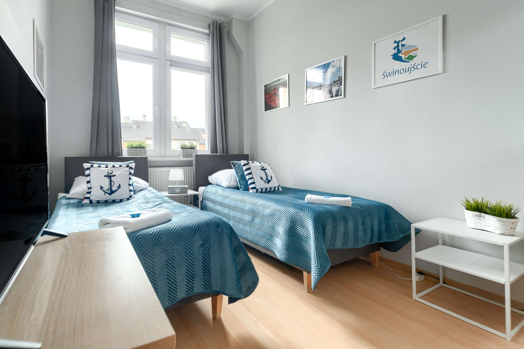 W pokoju znajdują się dwa telewizory – po jednym w każdej sypialni – oraz stół z czterema miejscami siedzącymi, który sprzyja wspólnemu spędzaniu czasu. To praktyczne i wygodne rozwiązanie, idealne zarówno na krótsze, jak i dłuższe pobyty.